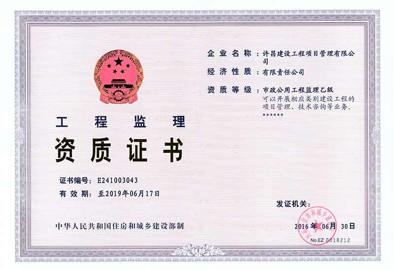乙級市政監(jiān)理資質(zhì)(正本)